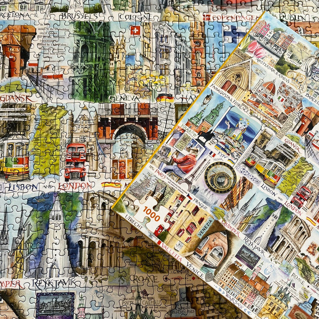 Discover Europe's most beautiful cities in this stunning 1000 piece jigsaw puzzle by Val Goldfinch.