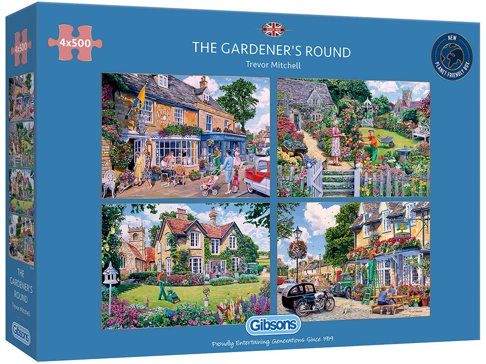 The residents of the local village certainly keep Colin the gardener busy! Whether its trimming the Royal Oaks flower baskets, repotting at Dotties tea room or mowing the vicarage lawn, Colin has a cheery smile for every passer-by. As with all Gibsons jigsaws, we use 100% recycled puzzle board, FSC paper and work with the best artists from all around the world. The beautifully illustrated pieces use the thickest puzzle board on the market.