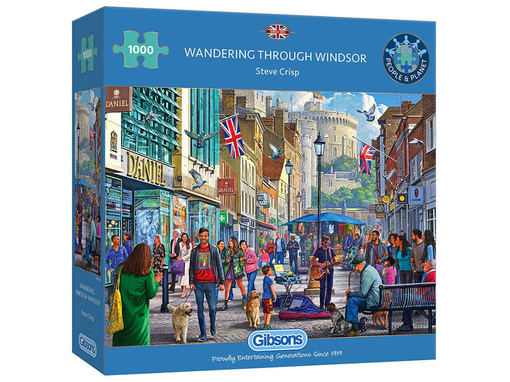 Take a trip to Windsor in the height of summer in this 1000 piece jigsaw puzzle from Steve Crisp. It is a beautiful day and the pedestrianised Peascod Street in Windsor is bustling with tourists, shoppers, street musicians and four-legged friends. In the background Windsor Castle is towering above them all in all its glory. As with all Gibsons jigsaws, we use 100% recycled puzzle board, FSC paper and work with the best artists from all around the world. The beautifully illustrated pieces are designed to fit perfectly together; in fact, we use the thickest puzzle board on the market.