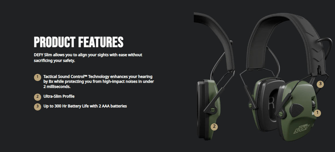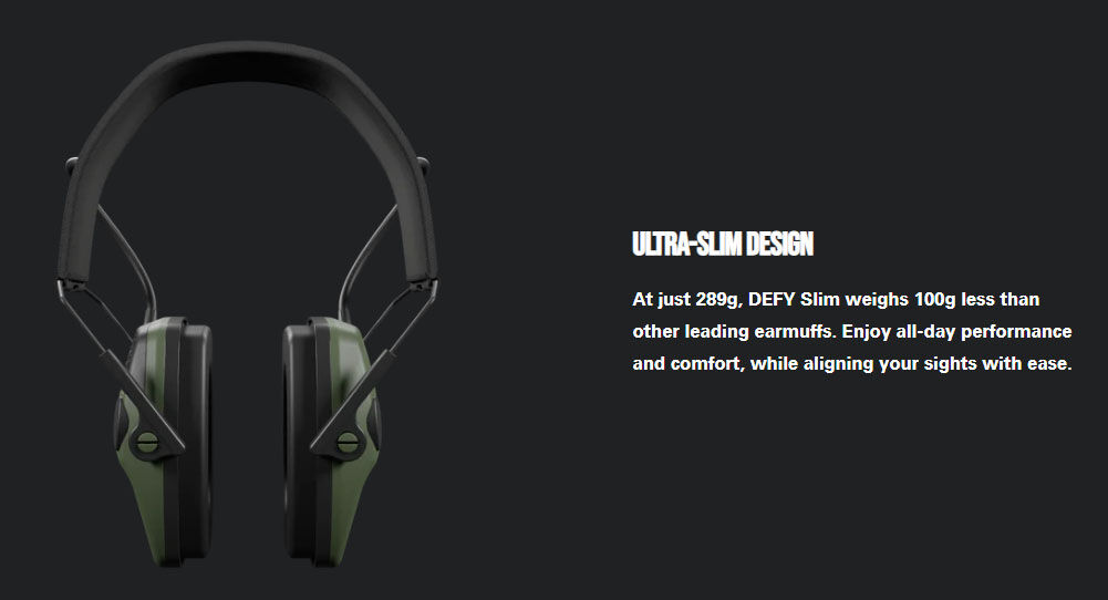 Same Great Protection. Slimmer Fit. DEFY Slim delivers superior protection in a no-frills, ultra-slim design. Tactical Sound Control allows you to hear and control ambient sound volumes, all while protecting you from harmful gunshot noises. DEFY Slim is the ultimate electronic earmuff for distraction-free, high-performance protection.