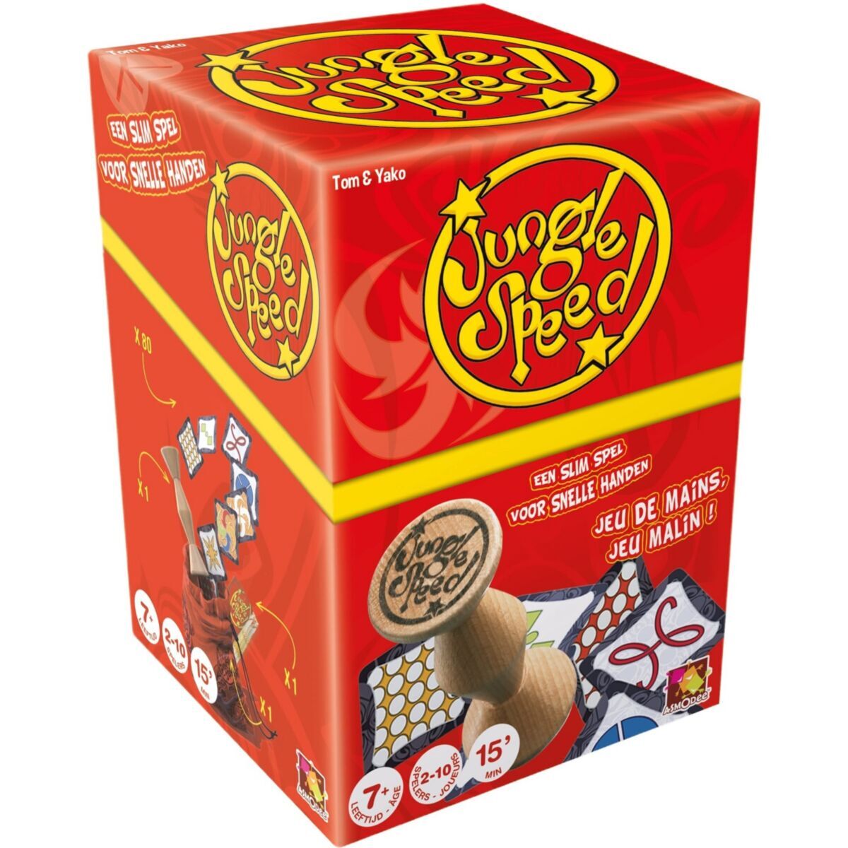 In Jungle Speed, you must rely on your keen sense of observation and quick reflexes. It requires a steady hand - which can be hard to maintain during the many fits of maniacal laughter! The wooden Totem sits in the middle of the table, waiting for the player with the fastest reflexes to snatch it up and win the game.