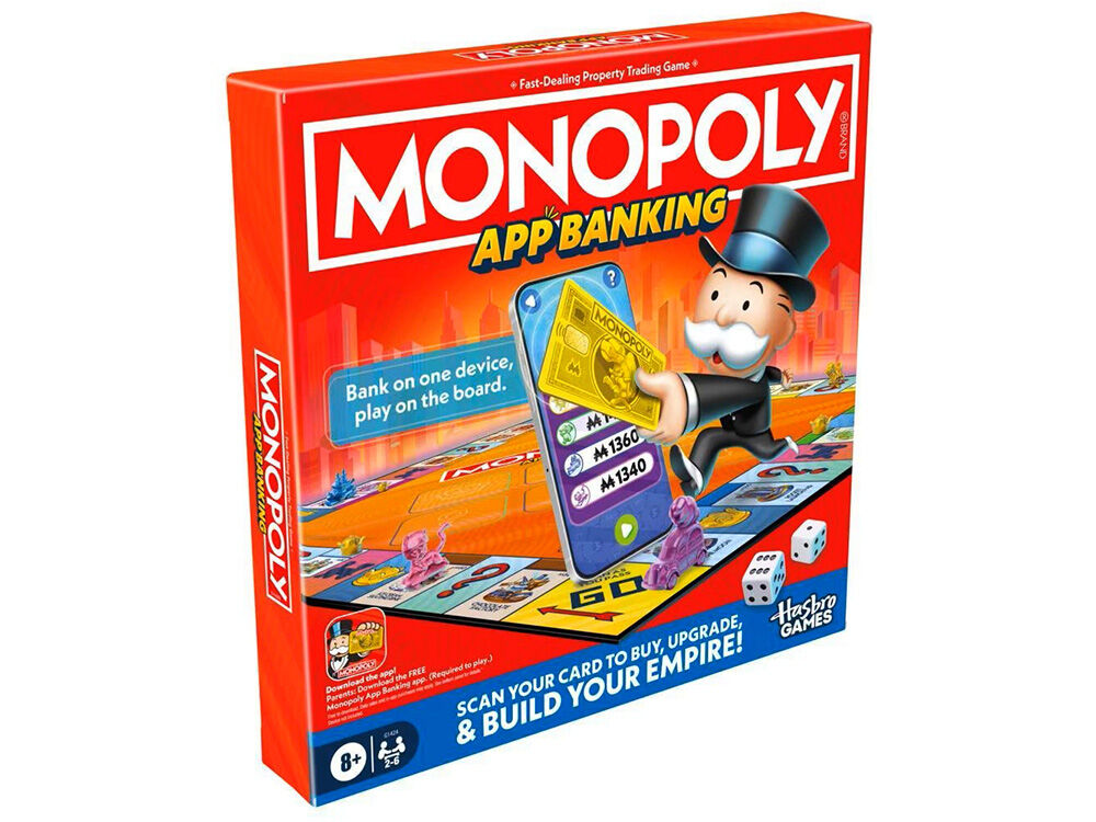 For the first time, ever, families can play the Monopoly board game with the help of an app for a faster game with super easy banking and other exciting fresh features. This is a complete game but it requires the Monopoly App Banking app to play. Scan the QR code in the instructions to download onto your smartphone or tablet. Land on a property? Scan the Title Deed. Then simply tap the devices screen to buy, auction, or pay rent! Ages 8 and up, for 2 to 6 players.