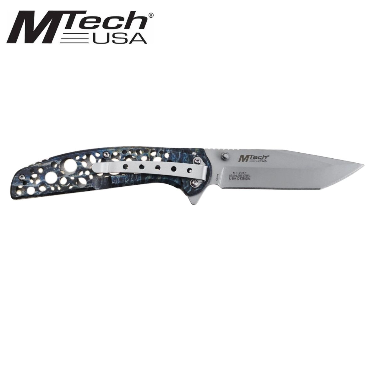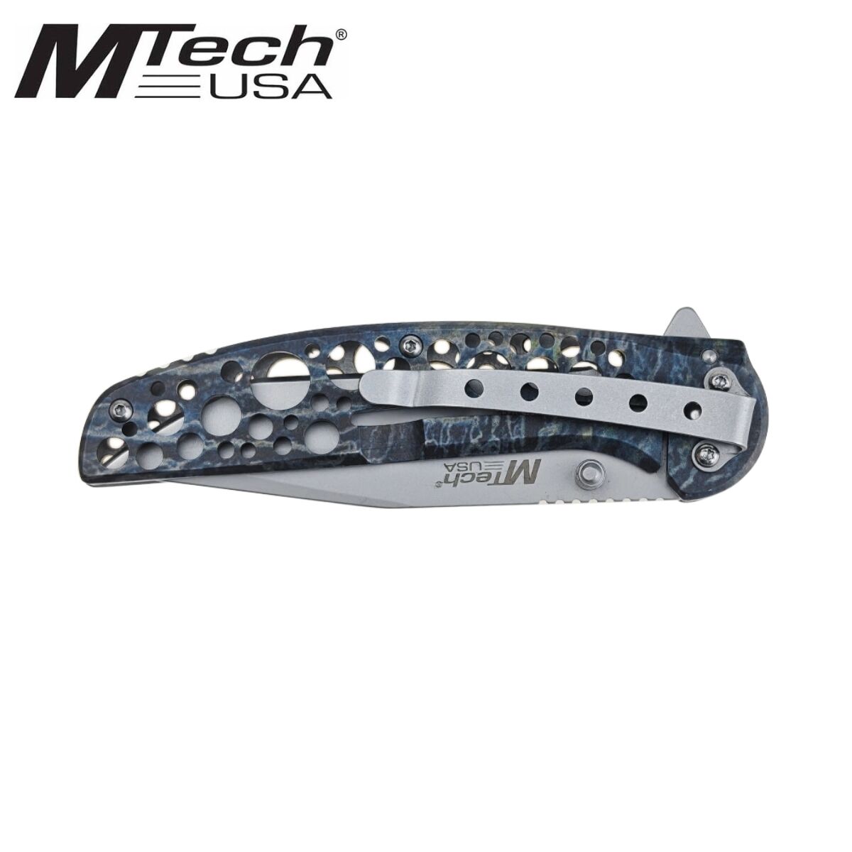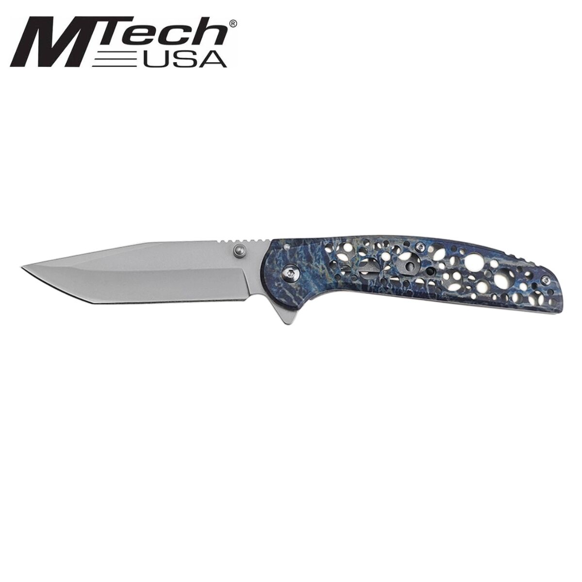 A blend of modern design and everyday practicality, the MTech USA Folding Knife features a striking blue marble-inspired stainless steel handle with precision-cut holes, creating a unique, galaxy-like aesthetic. The 3.53" 3Cr13 stainless steel drop point blade, finished with a bead blast, ensures durability and sharp performance. The frame lock mechanism provides secure operation, while its sleek construction makes it a stylish yet functional addition to your everyday carry.