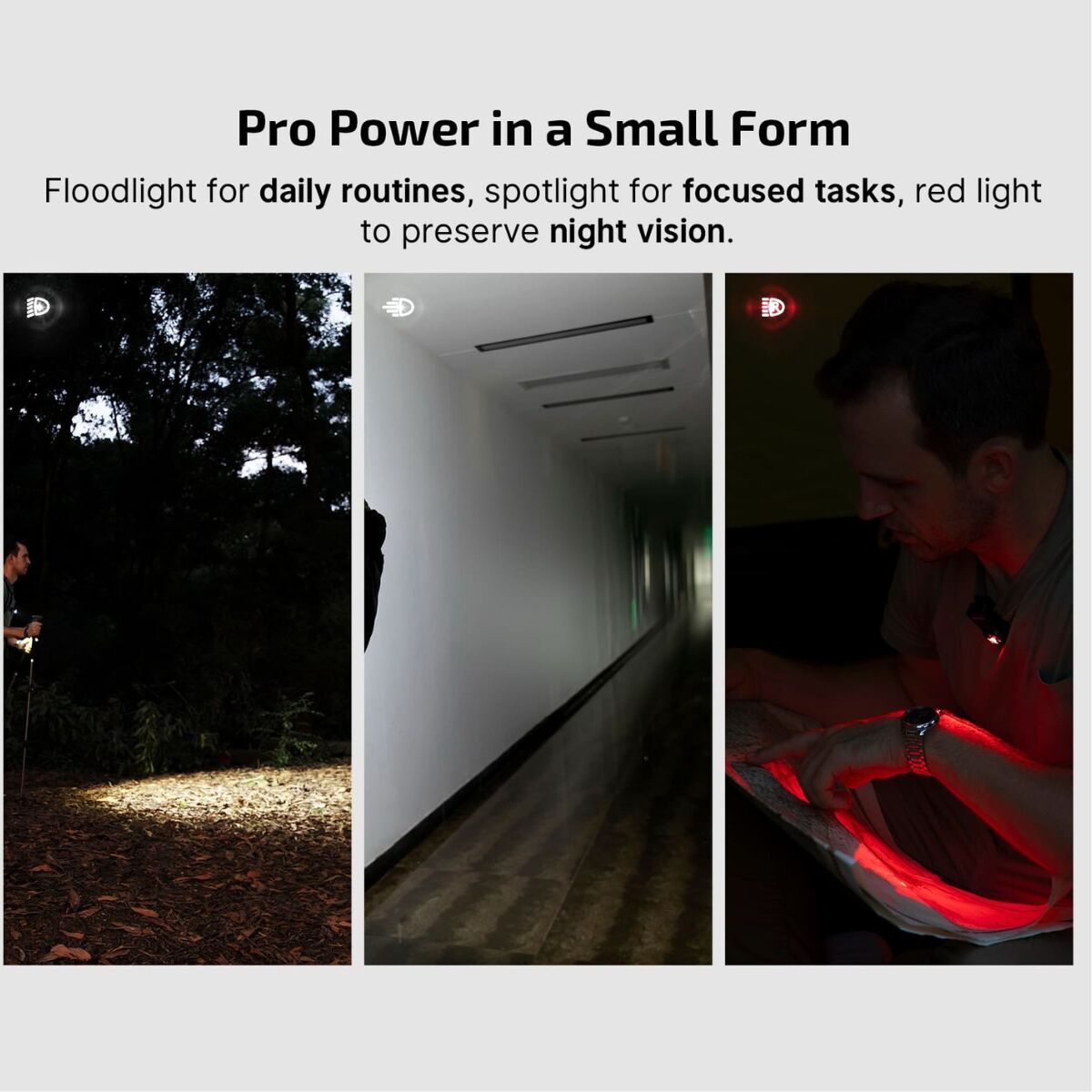 - Triple Light Modes: Spotlight for long-range, floodlight for daily use, and red light for night vision or signaling