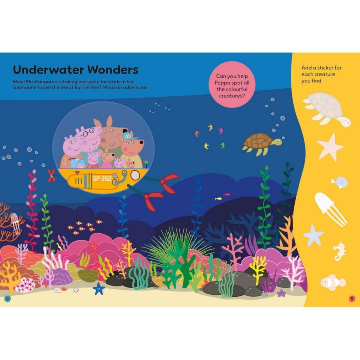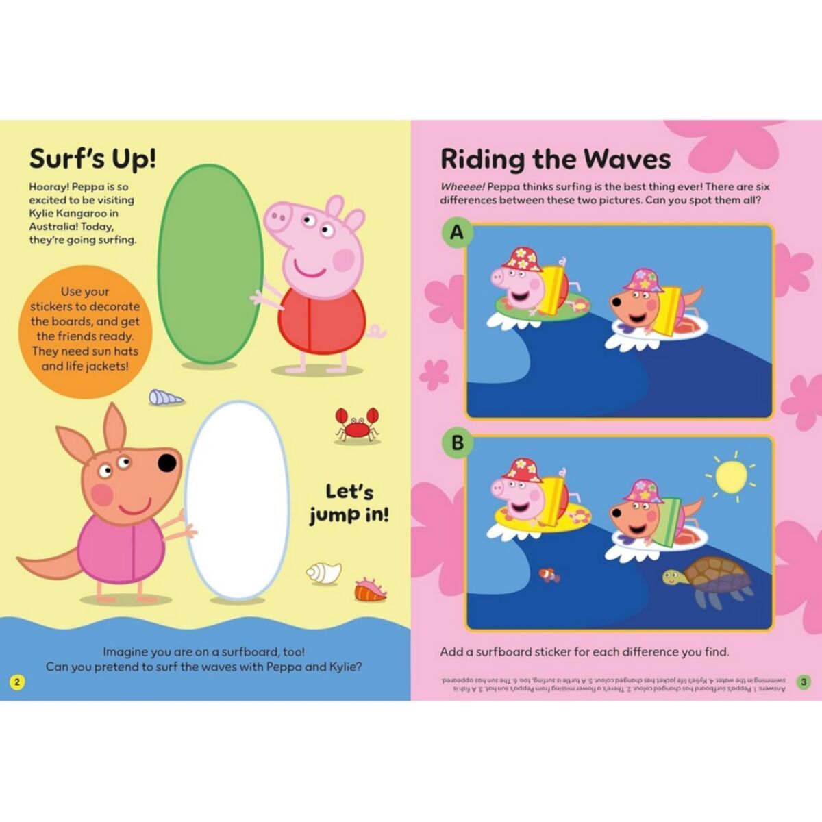 Who's ready for some awesome adventures with Peppa, her family and friends? Head to the beach along with Peppa and Kimberley Kangaroo as they learn to surf. Help them out by finishing the pictures and finding their life jackets! Then catch a ride in a submarine and explore the Great Barrier Reef. And how about an exciting trip to the city to spy some famous landmarks?