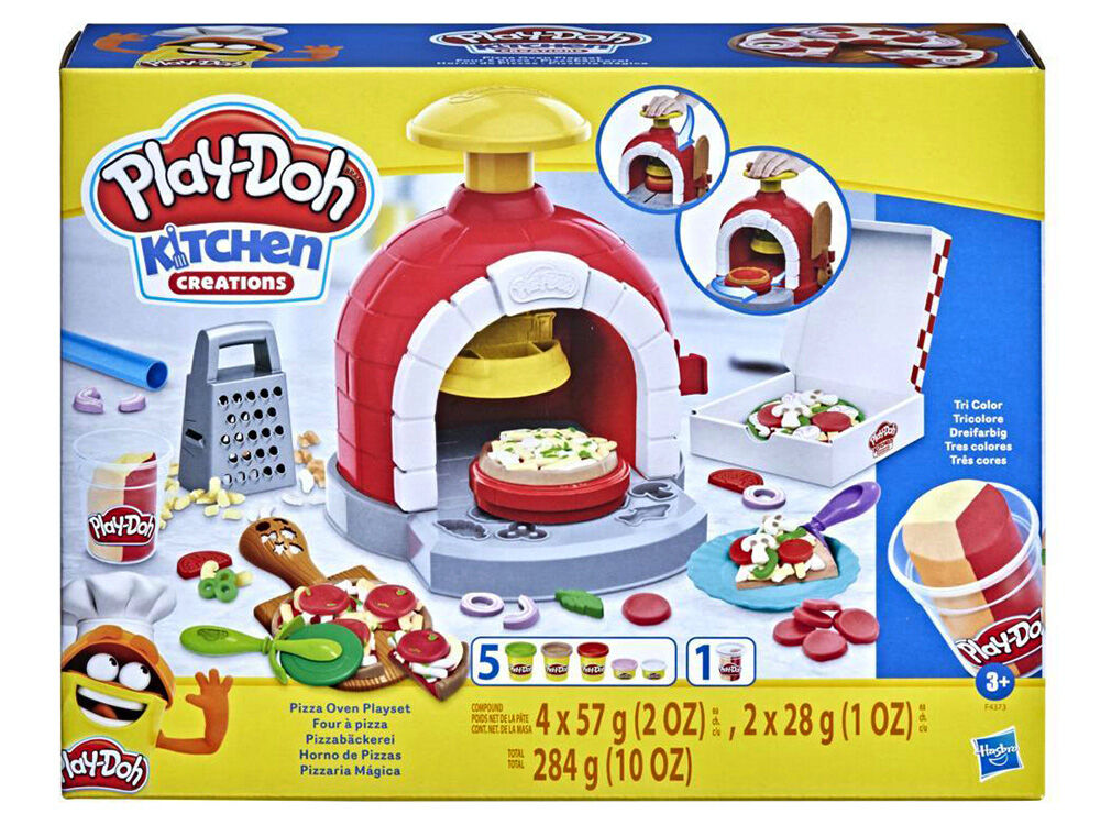 Imagination is on the menu with this toy pizza oven! Kids can play pretend chef as they stamp and spin out creative Play-Doh pizzas with over 25 possible pretend toppings. The play food set includes 8 tools to help inspire future cooks' creativity, and 6 modeling compound colors including a tricolor can with pizza-themed colors. Kids can also get their pretend pizzas ready for delivery in the pizza box.