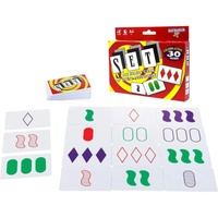 In SET, each card contains 1-3 objects, with all of the objects on a card having the same color, shape and shading, e.g., two purple shaded ovals. Colors, shapes, and shadings come in three different types: green, purple and red; oval, diamond and squiggle and solid, shaded and outlined.