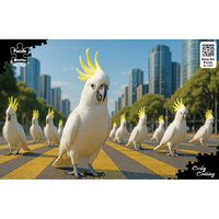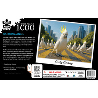 This 1000-piece puzzle invites you into a playful Australian scene where nature and urban life collide in unexpected ways. A group of cockatoos confidently strolls across a pedestrian crossing, their vibrant plumage and iconic crests bringing character and charm to an otherwise familiar city moment. The scene captures the quirky spirit of Australia's wildlife, reimagined within a modern urban setting.