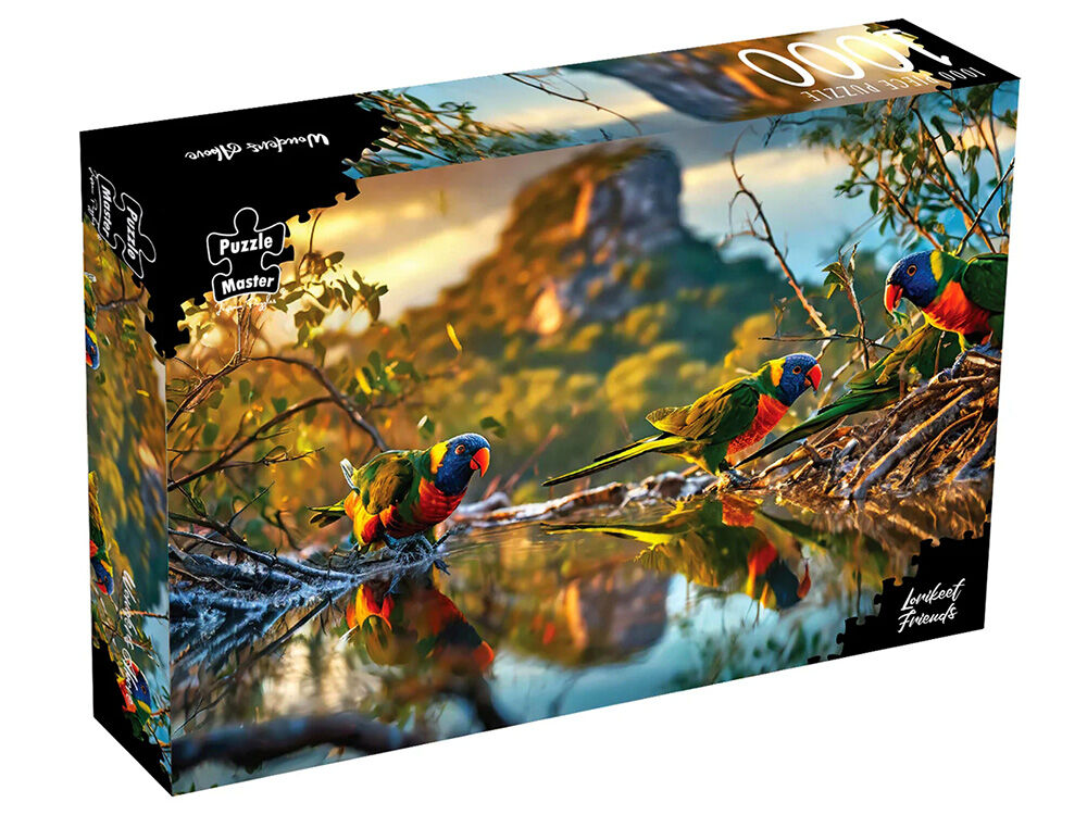 Immerse yourself in the vibrant beauty of Australia's birdlife with the Puzzlemaster 1000-Piece Jigsaw Puzzle "Lorikeet Friends." Part of the Surreal Australia Collection, this stunning puzzle showcases a trio of rainbow lorikeets, their brilliant plumage reflecting in the water as they gather in a serene natural setting. With breathtaking scenery and dynamic color contrasts, this puzzle is perfect for bird lovers, nature enthusiasts, and those who appreciate Australia's rich wildlife.