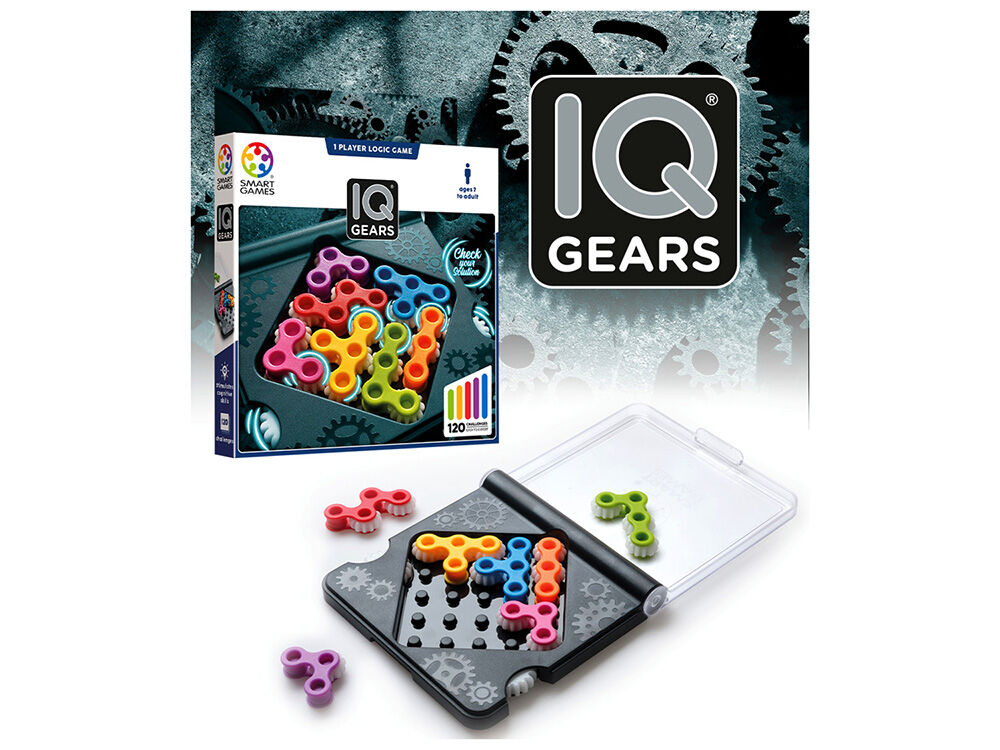 An IQ game that will put your brain in high gear! Can you fit all the gears on the game board? When you have the correct solution, the pieces will connectand the big wheels on the sides of the gameboard will spin together! Includes 120 challenges, from easy to expert.