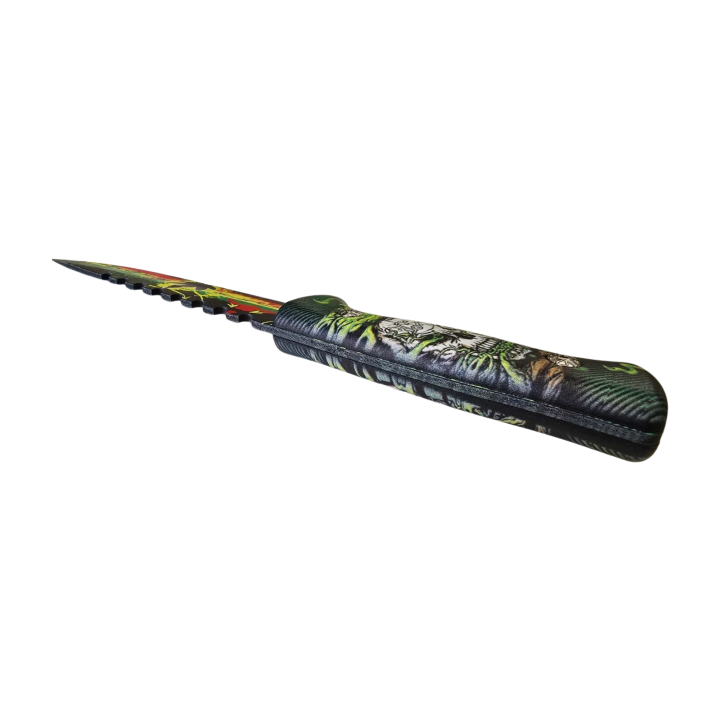 • Full tang, 440 stainless steel blade, sawback, vibrant printed scene