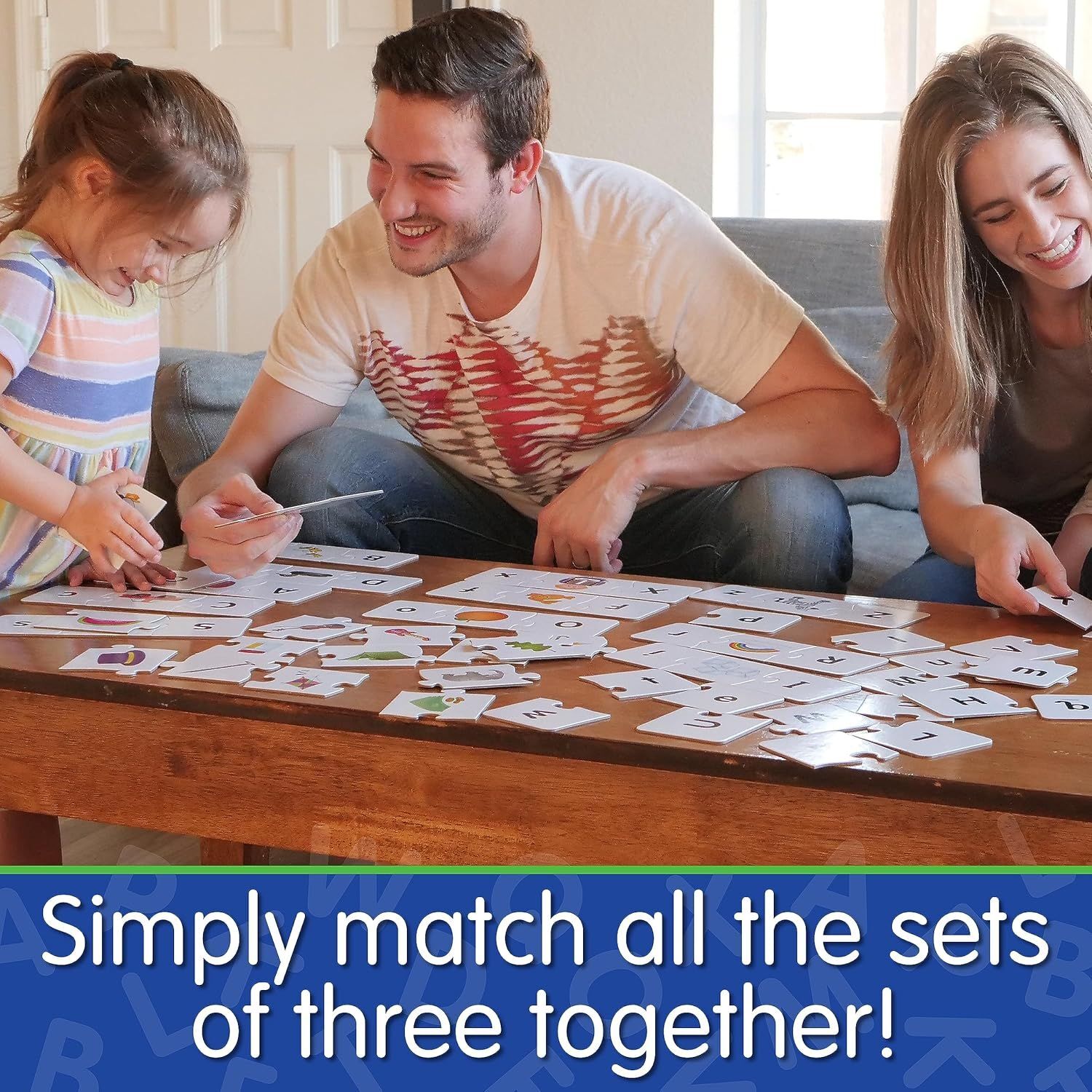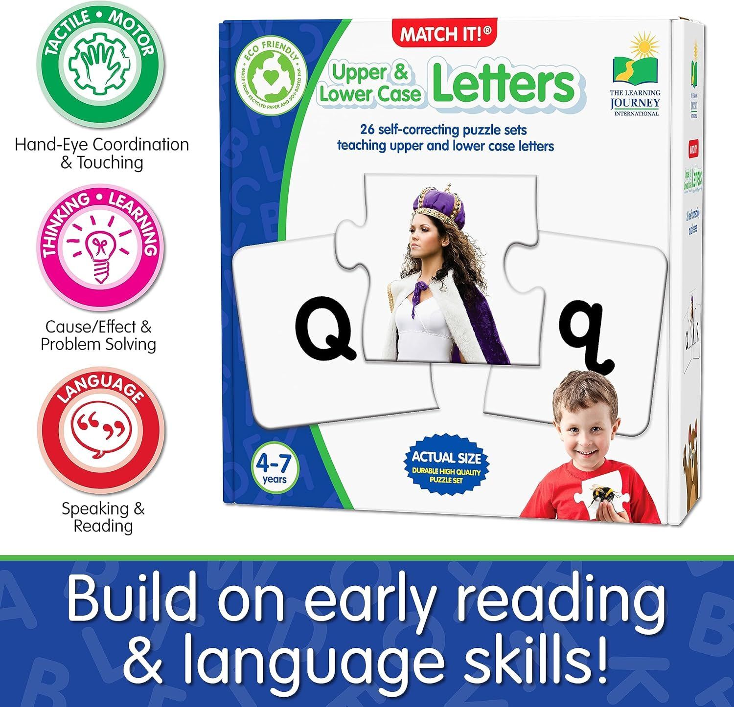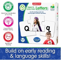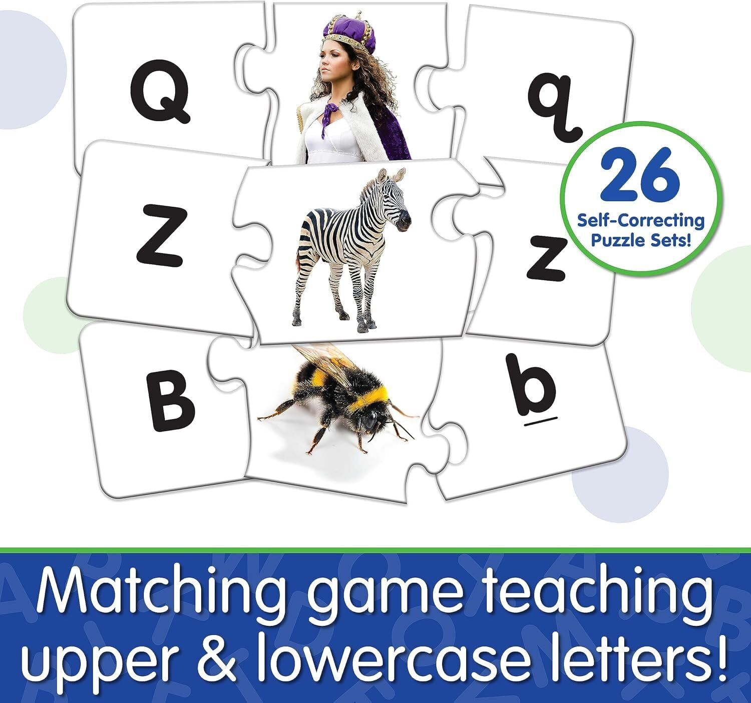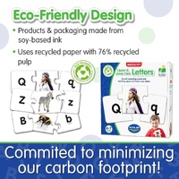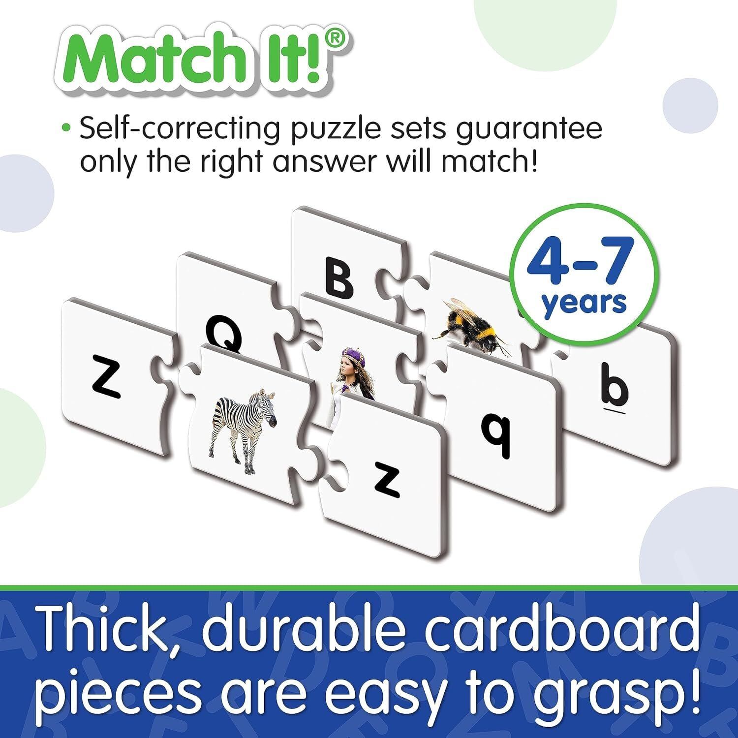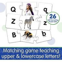 Each card features the upper case letter, a picture of an object that starts with that letter and the lower case letter. Simply match the three pieces together to complete the puzzle. The puzzles are self-correcting as no two puzzle cuts are the same. It's a fun way to learn about letters and to practice problem-solving.