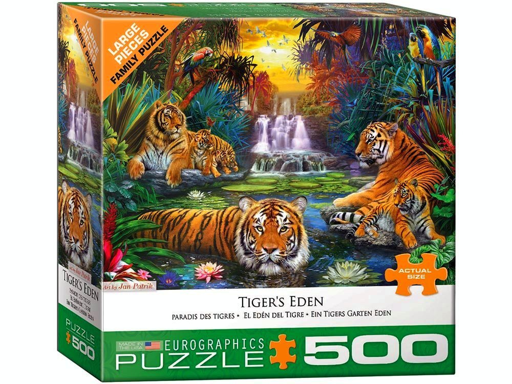 EuroGraphics Tiger's Eden 300-Piece Puzzle (Small box). Eurographics Family at the Jungle fantasy scene of 3 tigers resting in at the waterfall. Strong high-quality puzzle pieces. Made from recycled board and printed with vegetable based ink.