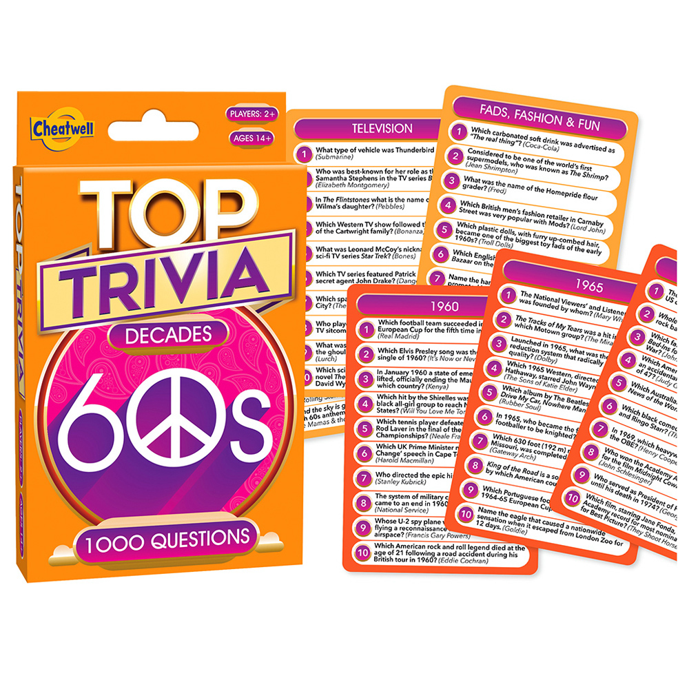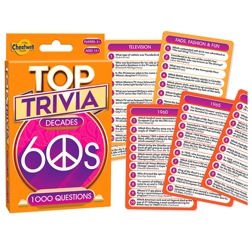 They say if you can remember the Sixties, you were not there! This collection of nostalgic trivia is a reminiscent ramble through the decade that changed everything. Mod or Hippie, Stones or Beatles fan, this quiz card pack comes jam-packed with 1,000 fascinating questions on all the fads, fashion, and fun from the Swinging Sixties. From the Space Race to the British Invasion, Flower Power to the World Cup, its a terrific trip down memory lane - just add the contestants! Suits Ages 14+, 2+ Players.