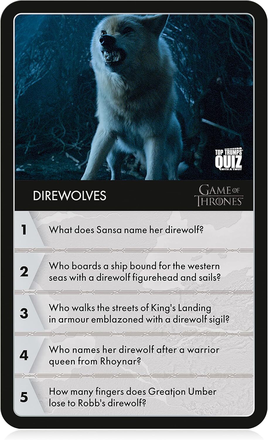 Spanning everything from Castle Black to Kings Landing, Casterly Black and Dorne, with questions about all eight seasons of the iconic HBO series, players are sure to have their knowledge and memory tested across 100 different category cards, featuring Tyrion Lannister, Cersei Lannister, Arya Stark, Daenerys Targaryen and many more. Sieges, weapons, quotes and behind-the-scenes facts are just some of the challenges that lie ahead, so steel yourself, sharpen your memory and get ready for a battle of wits.