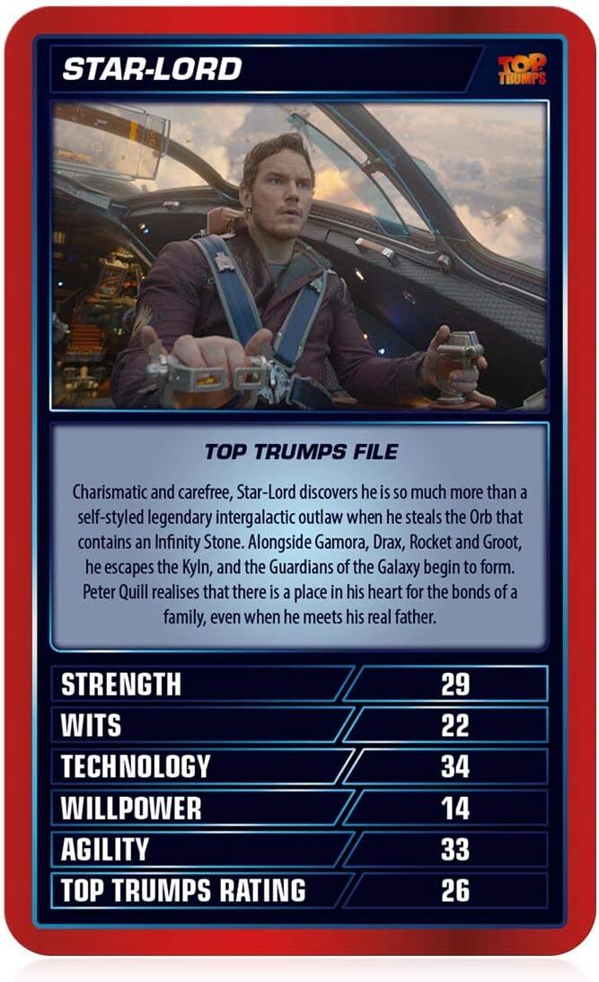 Featuring a plethora of inspirational superheroes from across the globe. We've hand-picked thirty of our favourite heroes and villains and pitted them against each other in this brand new edition of Top Trumps: Marvel Cinematic Universe. With stars like Black Widow and Star-Lord, Doctor Strange, Shuri and Black Panther, plus villains like Thanos, War Machine and Loki, choose from categories including strength, technology and wisecracks and battle to see which of these superpowered icons is the greatest!