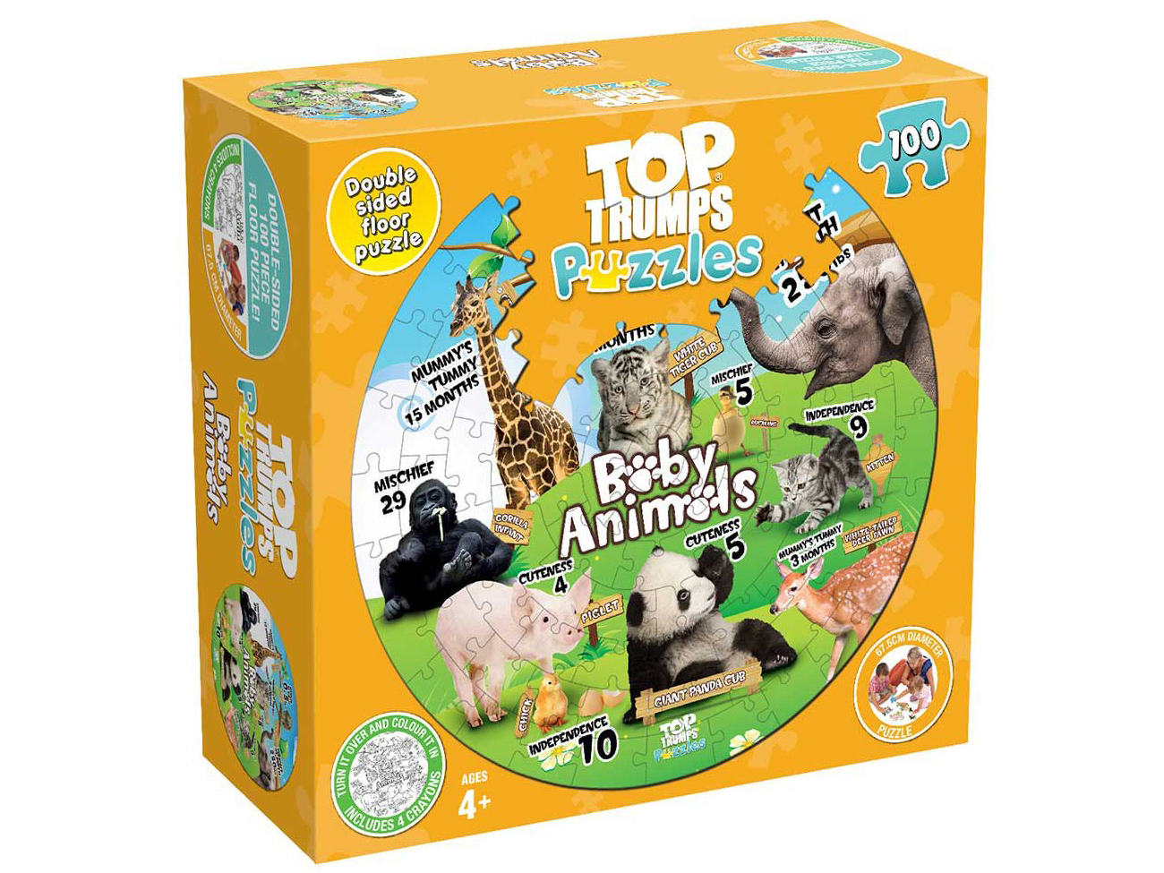 Top Trumps double-sided floor puzzle. As you piece together the round 100 piece puzzle, you'll read various facts and stats about Baby Animals. Puzzle is double-sided and has 4 crayons so you can flip it over and colour it in! Includes 8 bonus Top Trumps cards inside to play a mini-game with, or to add to a pack of Top Trumps!
