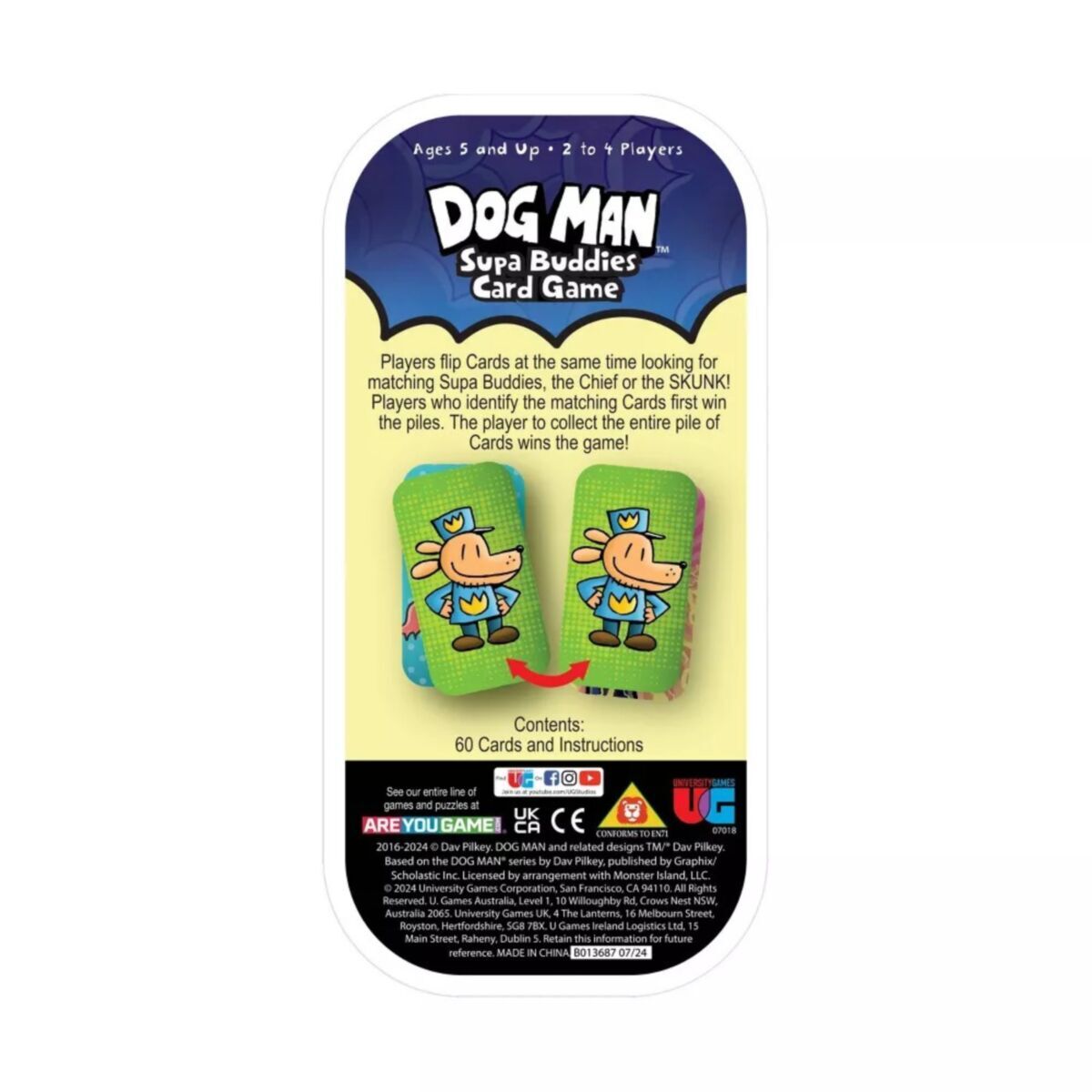 Based on Dav Pilkey's Dog Man books series, the Dog Man Supa Buddies Card Game is a fast-paced and portable game for kids 5 and up and their families. Players flip Cards at the same time, looking for matching Supa Buddies, the Chief, or the SKUNK! Players who identify the matching Cards first win the piles. The player to collect the entire pile of Cards wins the game! Dav Pilkey's Dog Man series has sold more than 60 million copies. This game includes characters from the book series and the Dog Man Scarlet Shedder book.