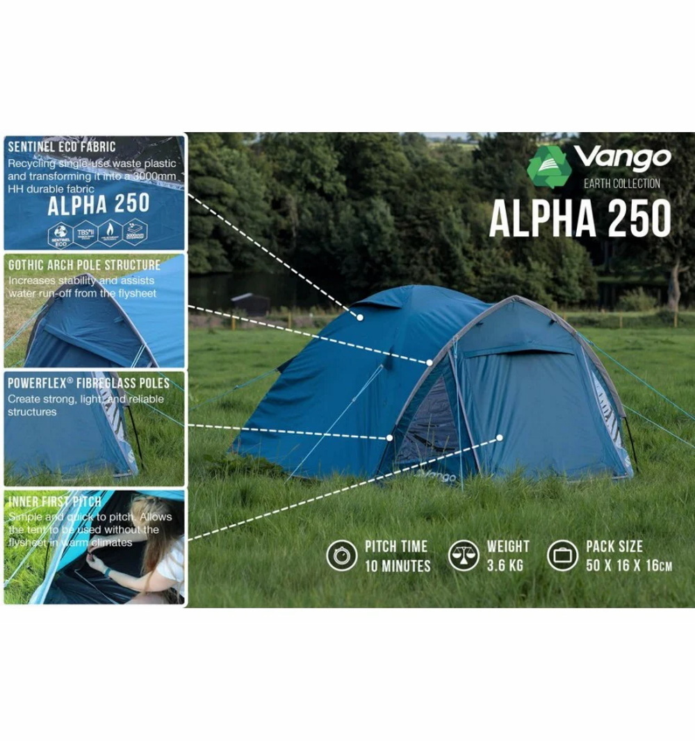 The Alpha 250 2-man tent is an easy-to-pitch tent with linked-in groundsheet that features a stylish, yet functional gothic arch porch for storing kit.