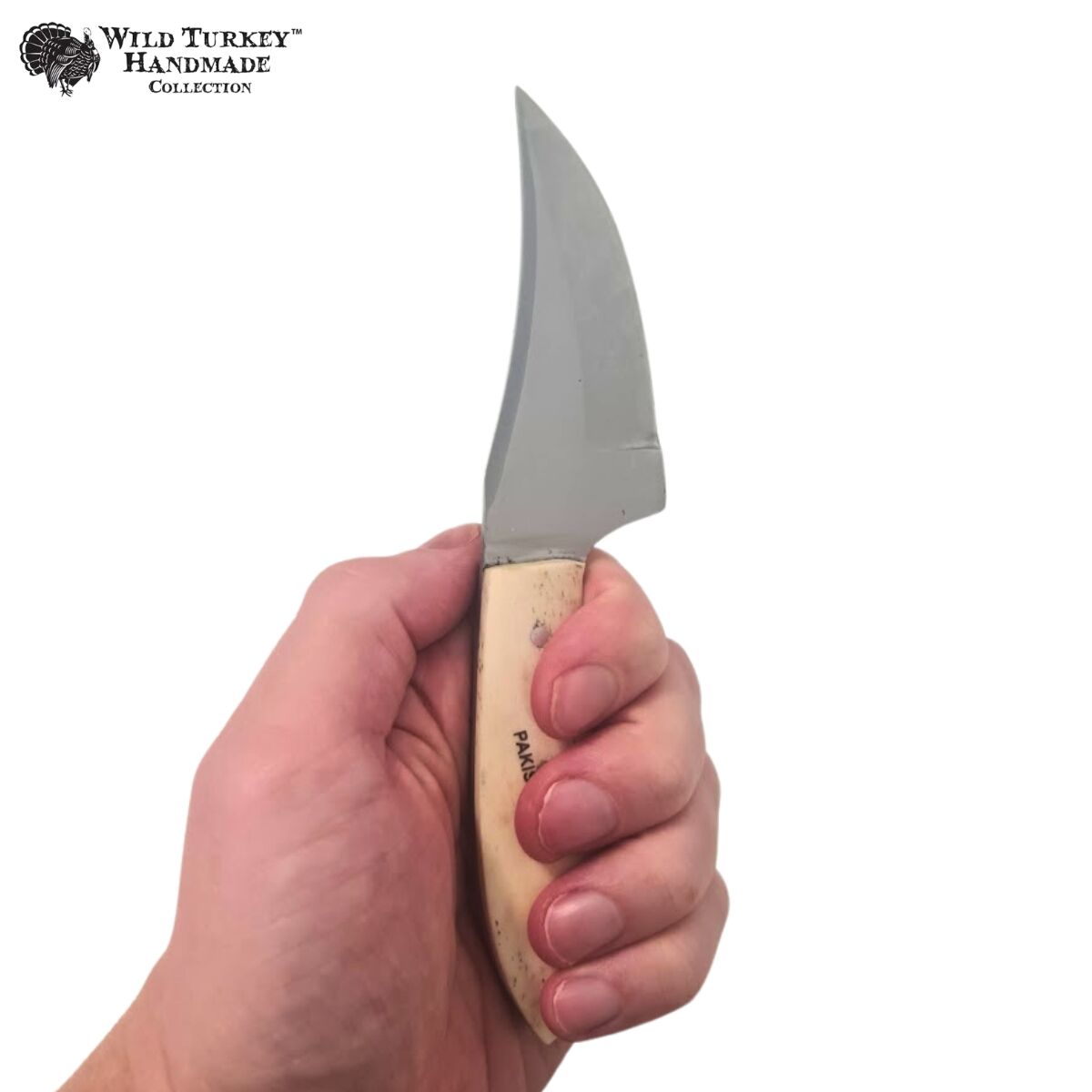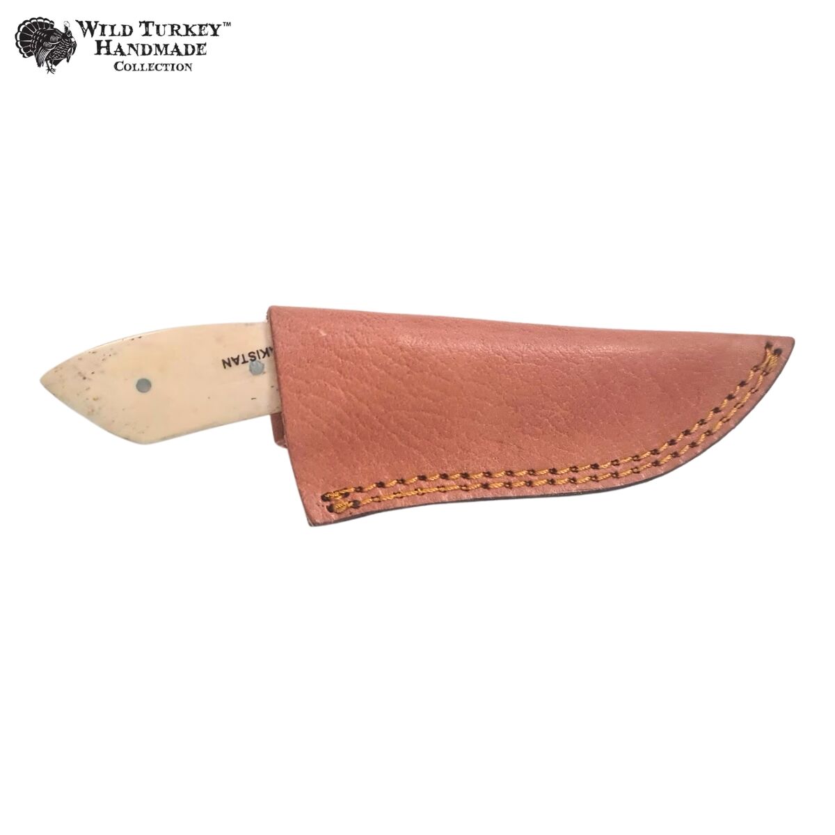 The Wild Turkey Handmade Collection Fixed Blade Hunting Knife is a compact yet reliable tool for outdoor enthusiasts. Featuring a durable stainless steel blade and a genuine bone handle, this knife offers a classic look with a sturdy grip. With its 7" overall length, it's perfect for hunting, skinning, and general outdoor use. The included leather sheath ensures secure storage and easy carry.