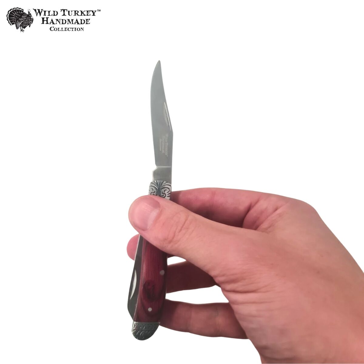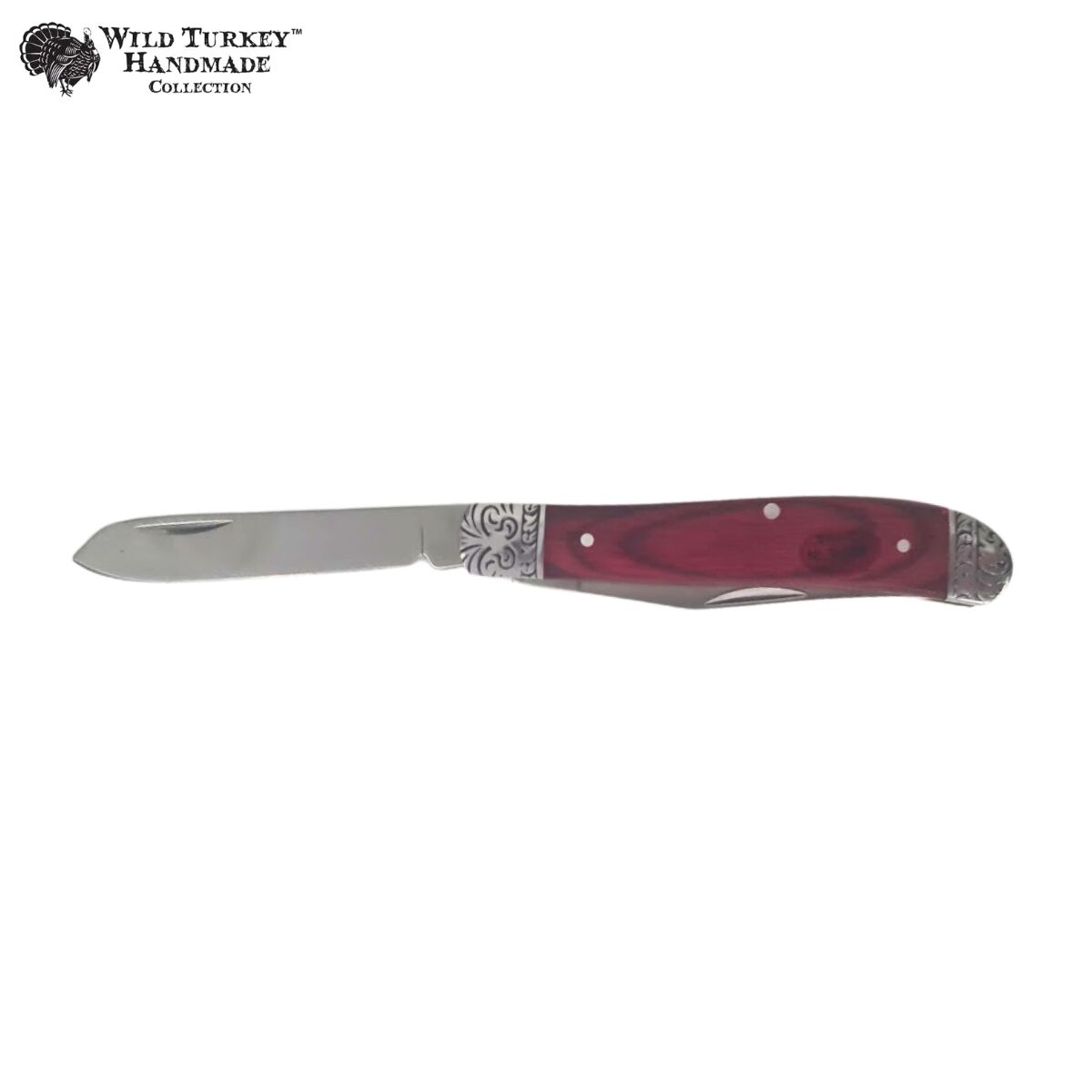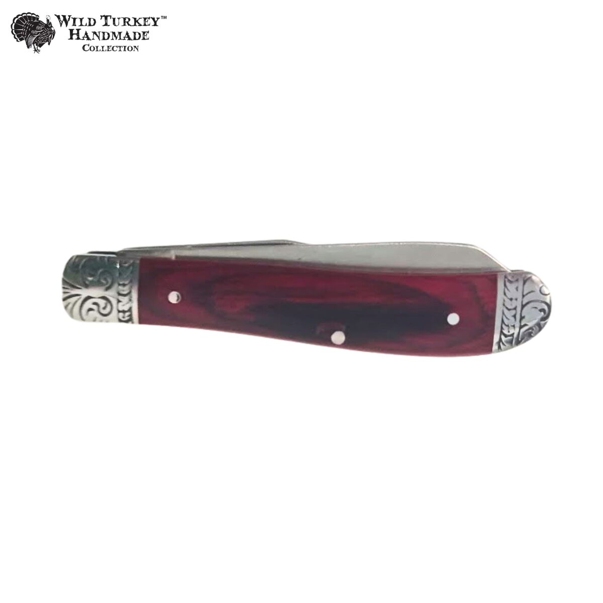 The Wild Turkey Handmade Red Gentleman's Knife is a refined and compact folder designed for everyday carry. Featuring a 2.75" stainless steel mirror-polished trapper blade, this knife offers both style and functionality. The 3.5" red wood handle, accented with engraved front and end bolsters, adds a touch of elegance to this classic design.